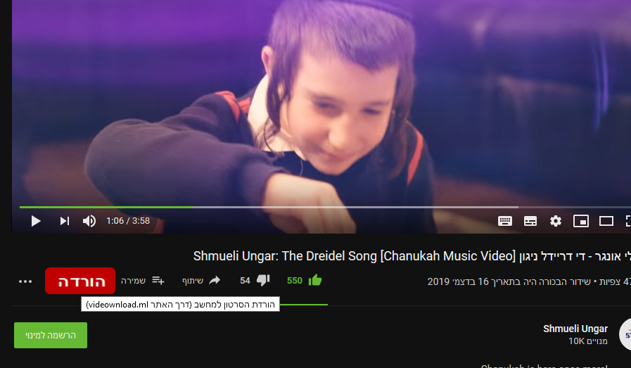 @chv אמר בתוסף | הורדה ישירה מיוטיוב דרך videownload.ml | כרום\פיירפוקס: @אנוממי למעלה בשורה, בין הסמל של כומתה לסמל של מוזיקה, תלחץ על הכפתור ייפתח לך רשימה, תמצא את ההורדה מיוטיוב תלחץ על הנעץ שלידו. אחרי זה הוא יופיע לך תמיד ליד הכומתה.. תלחץ עליו זה מוריד את הסרטון (אם אתר ההורדה יפעל כשתלחץ) תודה רבה הצלחתי